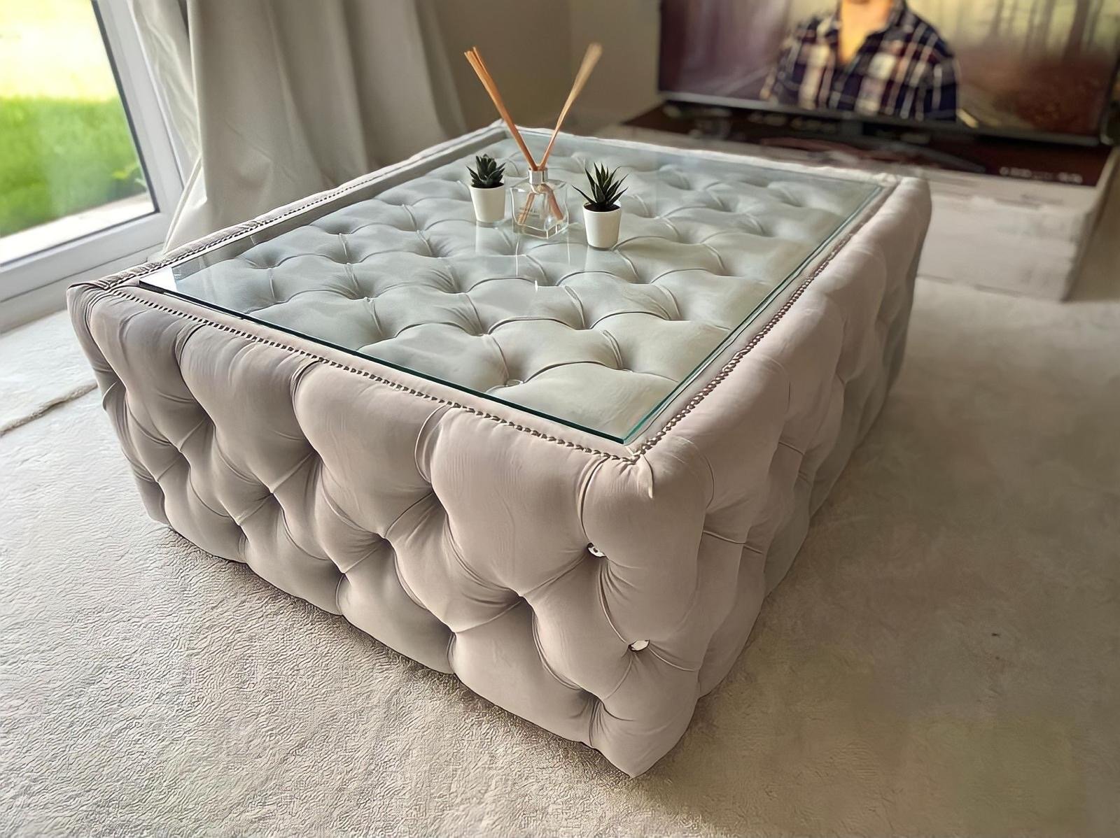 Bella Glass top Chesterfield Footstool Pouffe Coffee Table