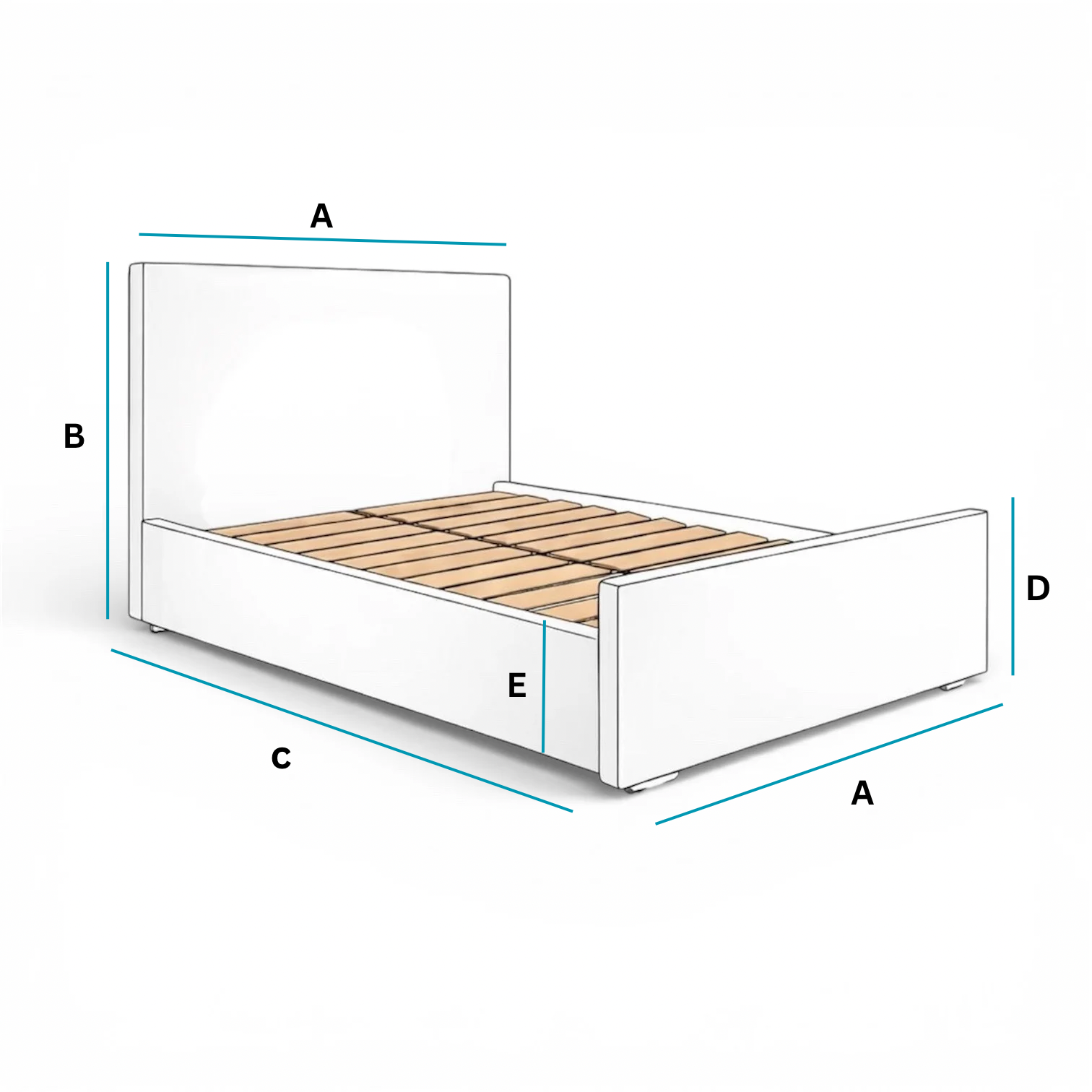 | Bed Size | A - WIDTH | B - Headboard Height | C - Length | D - Footboard Height | E - Base Height |