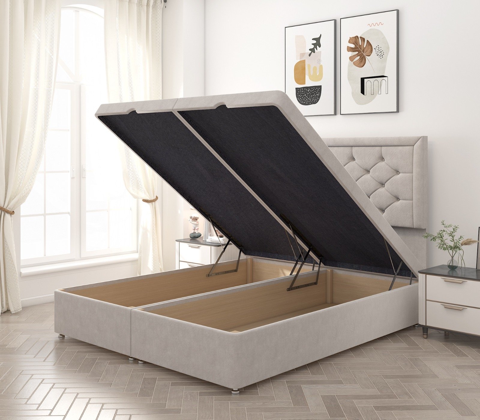 Upgrade your bedroom with the Hilton Chesterfield Ottoman Divan Bed, a perfect blend of timeless style, smart storage, and luxurious comfort. Featuring a handcrafted deep-buttoned Chesterfield headboard and matching footboard, this elegant upholstered bed makes a bold statement in any bedroom setting. Crafted with high-quality materials and attention to detail, the Hilton Ottoman Bed is designed not only to elevate your space but also to provide practical functionality. The easy-lift ottoman storage base offers generous under-bed storage, ideal for storing bedding, clothes, or seasonal items, helping you keep your bedroom neat and organized.